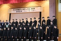 引き続き合唱発表です。大きな雨音が体育館の屋根をたたきつけ、合唱には最悪のコンディションとなりました。1年生の歌の後、中断して再度1年生から歌い直しました。再開後の1年生の曲紹介で「私たちの歌で雨を吹き飛ばします!」と宣言した通り、雨は小止みとなり、美しい歌声が体育館に響きました。2年生、3年生と学年が上がるごとに強弱、ハーモニーとも素晴らしい合唱が披露されました。最後の全校合唱も素晴らしく、場内は感動で包まれました。
